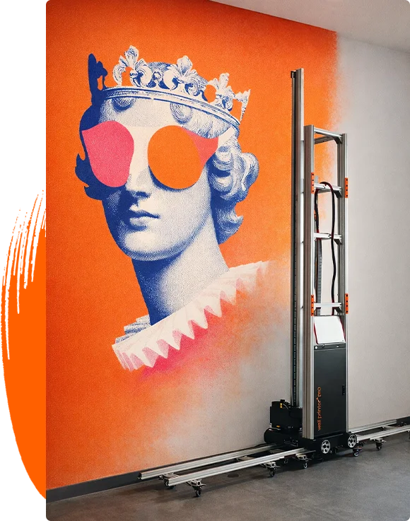Tak, dzięki innowacyjnej technice druku jest możliwe drukowanie na ciemnej powierzchni. Obraz jest drukowany pięcioma kolorami, co oznacza, że nasza drukarka ścienna ma do dyspozycji biały kolor. Dzięki temu jest w stanie najpierw wydrukować biały podkład (którego finalnie nie widać) i na nim dopiero nadruk. Daje to drukarce ściennej możliwość drukowania dowolnej grafiki na każdym kolorze, jednocześnie nanosząc bezbłędny obraz z idealnie odwzorowanymi kolorami na dowolnej powierzchni pionowej.